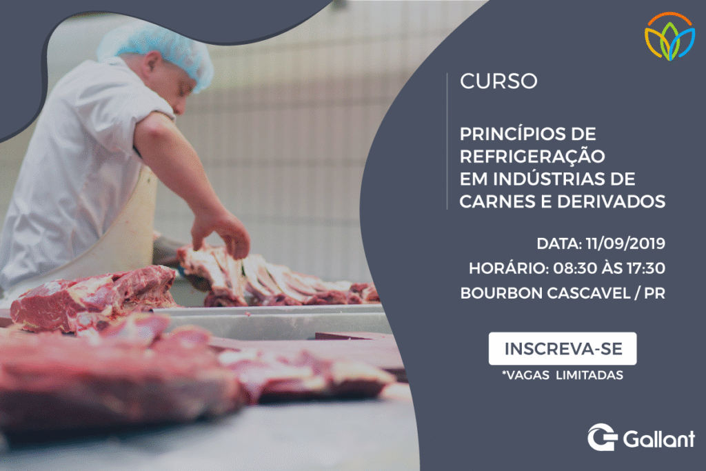 A Gallant em parceria com a Agroqualitá, promovem o curso de ”Princípios de Refrigeração em Indústrias de Carnes e Derivados”, que acontece no dia 11/09/2019, no Bourbon Cascavel Express Hotel – Cascavel/PR.